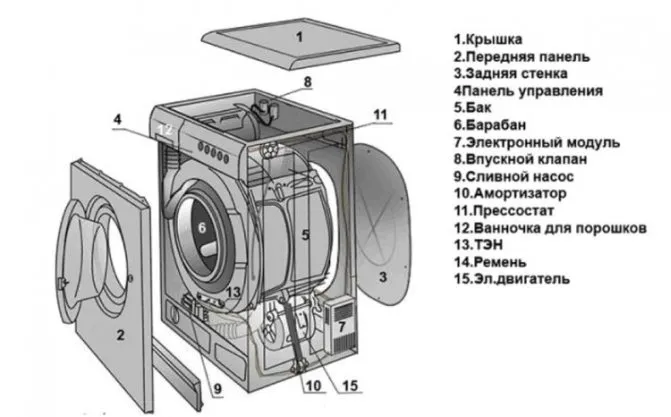 - Бак надежно соединен с корпусом при помощи амортизаторов и пружин.