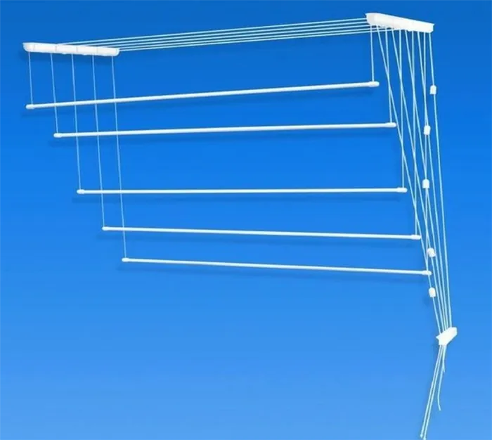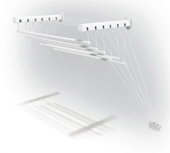 - Надежность конструкции. Потолочные сушилки способны выдерживать значительный вес, что особенно полезно, учитывая, что мокрая ткань намного тяжелее сухой. Это предотвращает деформацию и поломку устройства.