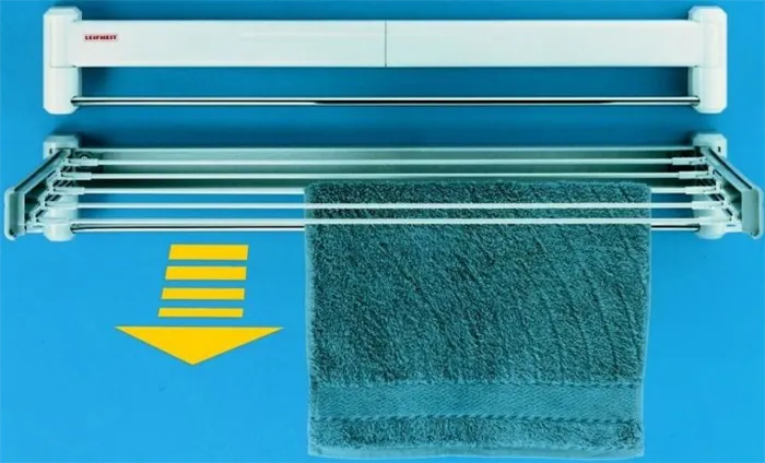 - Настенные сушилки представляют собой раздвижные металлические конструкции. Однако такие системы часто громоздки, и не каждое помещение может позволить такое решение, так как это не всегда практично.