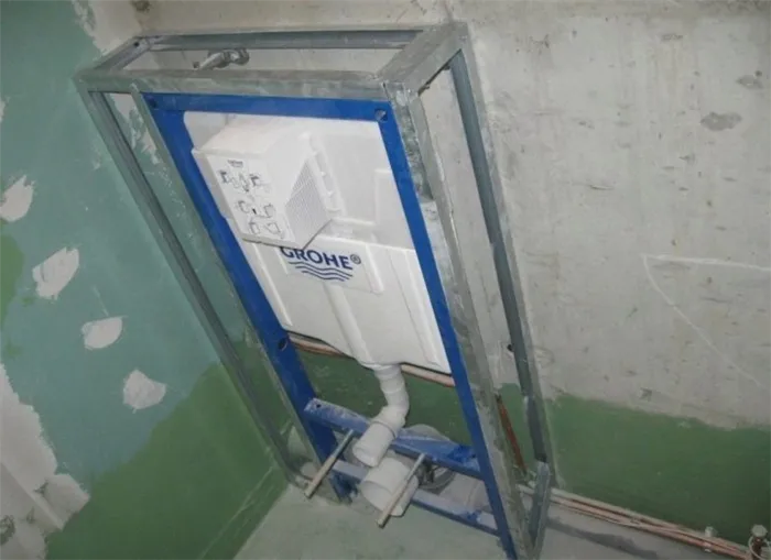 Встраиваемый или скрытый унитаз фиксируется не к стене, как может показаться на первый взгляд, а к специальной конструкции, размещенной за перегородкой. Эта структура называется «установка». Это металлический каркас, прикрепленный к стенам и полу. К этому каркасу монтируются не только чаша унитаза, но и кнопка смыва, а также все коммуникации.